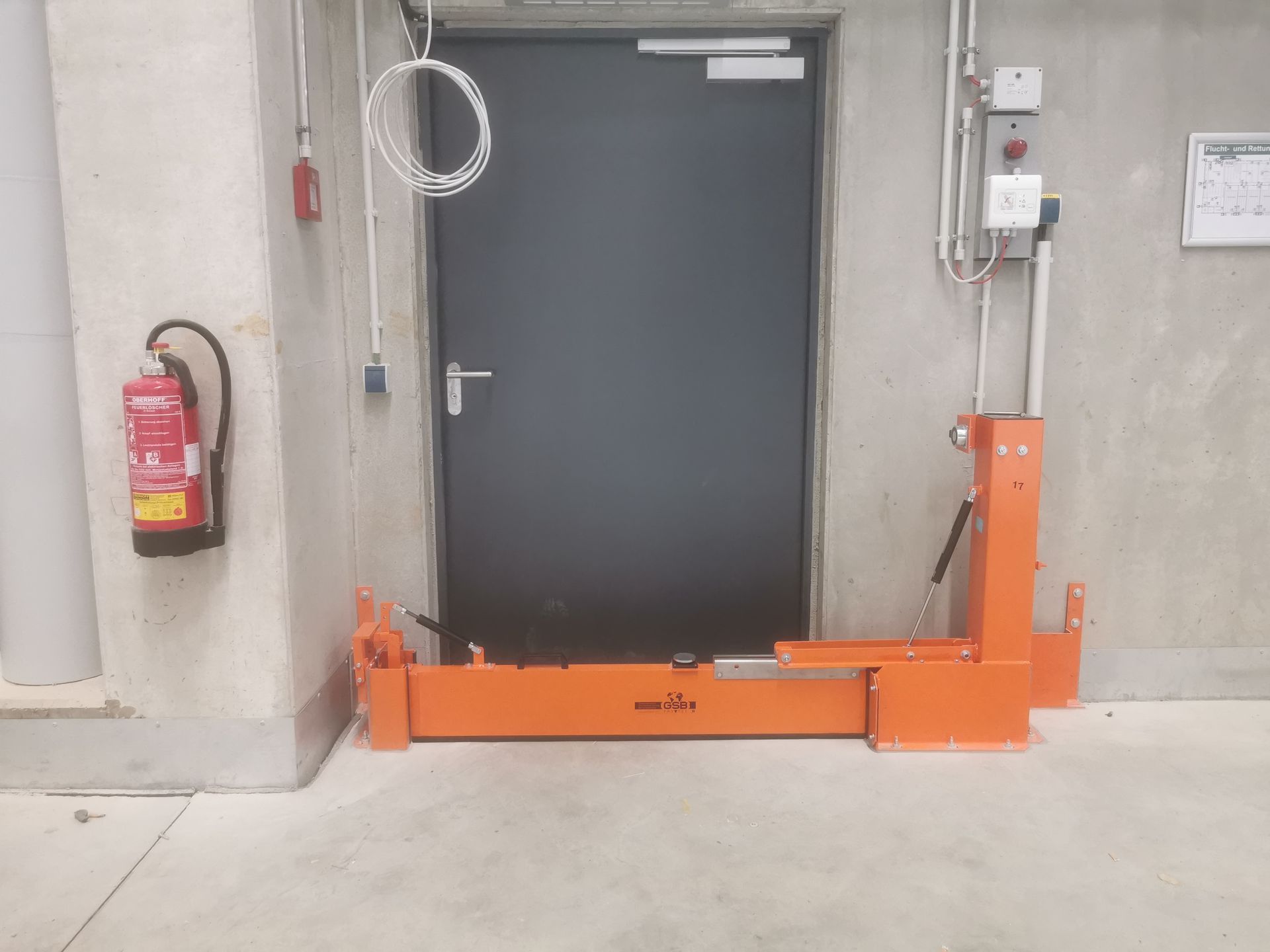 Die Löschwasserbarriere besteht auf der einen Seite aus einem am Boden befestigten Stahlscharnier, auf der gegenüberliegenden Seite aus einem Stück U-Profil-Stahl-Aufnahme sowie der entsprechend der Rückhaltehöhe geforderten Leichtmetallbarriere. Durch einen Elektromagnet wird die Leichtmetallbarriere in der senkrechten Ruhelage gehalten. Nach Aktivierung schwenkt der Sperrkörper gedämpft in das gegenüberliegende U-Profil in eine waagerechte Verschlussstellung. Die Barriere wird hier selbsttätig durch einen Schnellspanner verriegelt. Die Entriegelung und die Rückstellung der Barriere in die senkrechte Ruhelage erfolgt manuell.